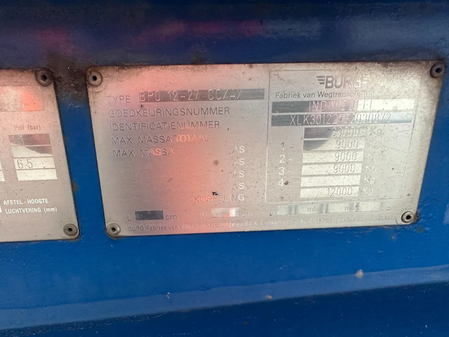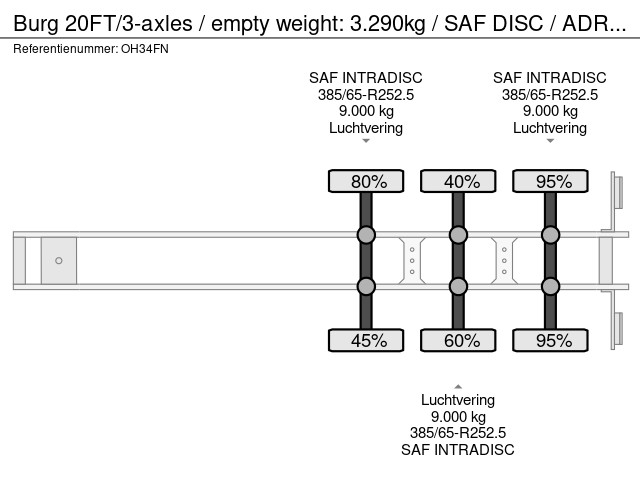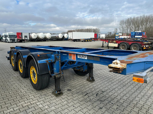 zeer mooi 2003 BURG 20FT ADR-chassis met ABS/EBS, SAF-assen met schijfremmen (INTRADISC), ADR (EXII, EXIII, FL, OX, AT), 1e as = liftas, 1x20FT, leeggewicht: 3.290kg, max. massa: 39.000kg, 385/65-R22.5 banden (profiel links: 7/10/15mm; profiel rechts: 13/6/15mm), Nederlandse registratie