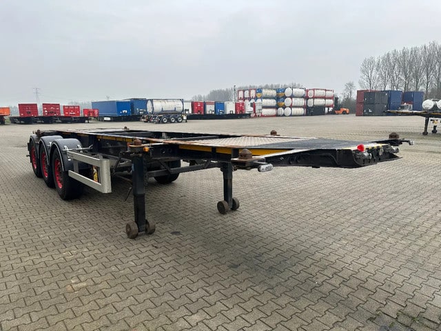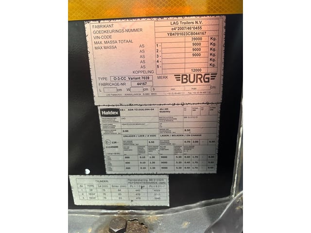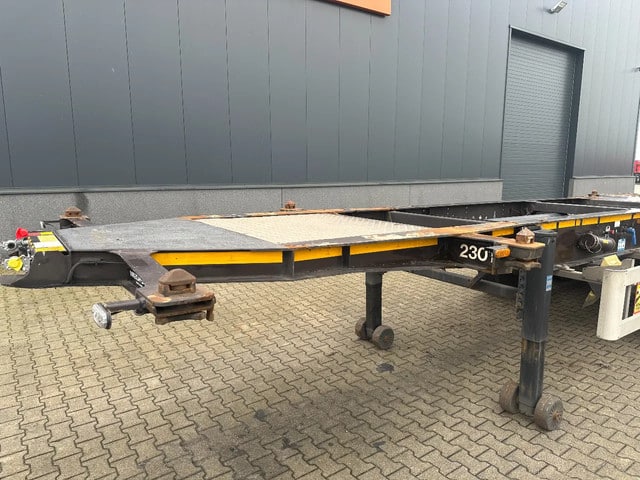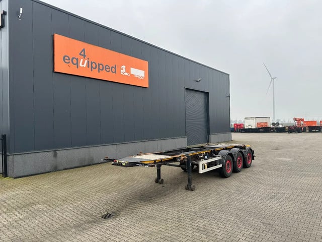 zeer mooi 2012 BURG 20FT ADR-chassis met SAF-assen met schijfremmen (INTRADISC), ADR (EX/II, EX/III, FL, AT) geldig t/m 15-07-2025, ABS/EBS, 1e as + 2e as = liftas, ALCOA-velgen, leeggewicht: 3.690kg, max. massa: 39.000kg, 385/65-R22.5 banden (L: 11/7/13mm; R: 10/7/14mm), Nederlandse registratie
