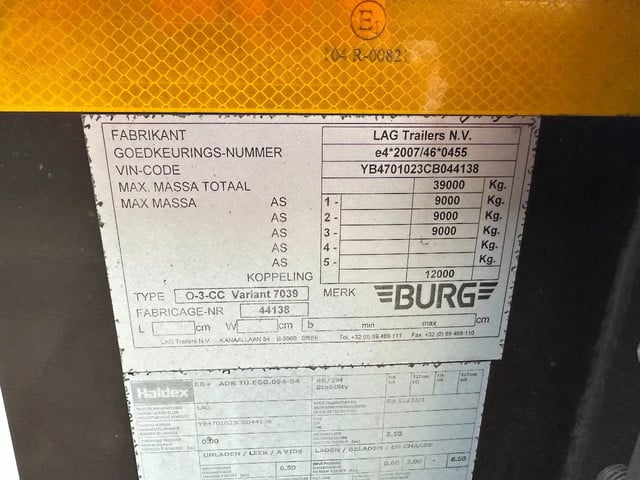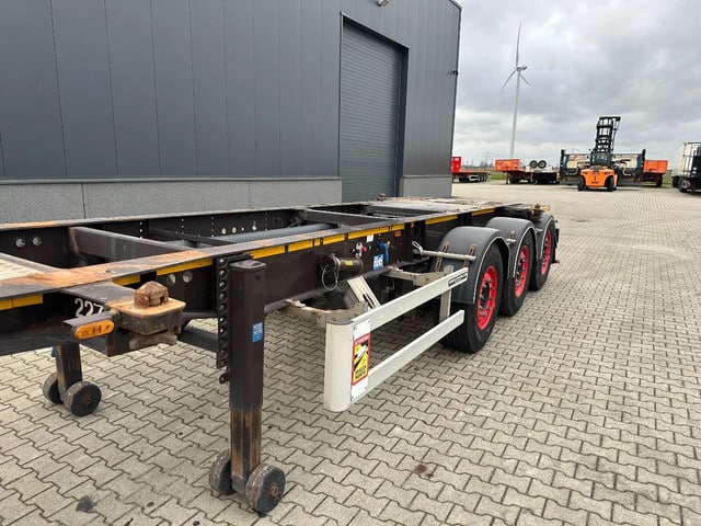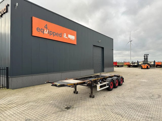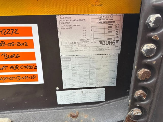 zeer mooi 2012 BURG 20FT ADR-chassis met SAF-assen met schijfremmen (INTRADISC), ADR (EX/II, EX/III, FL, AT), ABS/EBS, 1e as + 2e as = liftas, leeggewicht: 3.690kg, max. massa: 39.000kg, 385/65-R22.5 banden (L: 10/11/11mm; R: 8/12/11mm), Nederlandse registratie