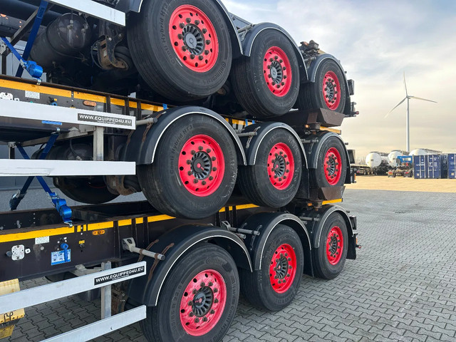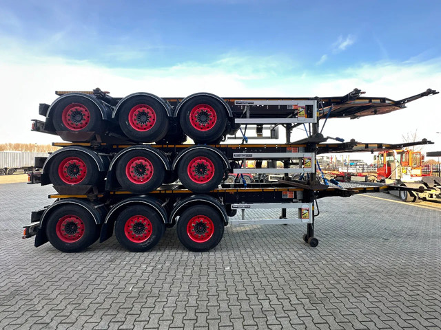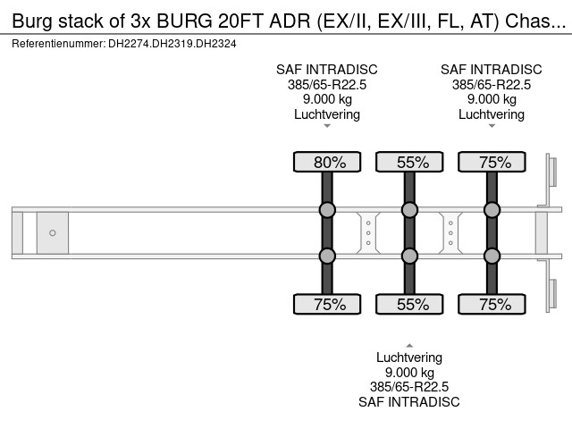 stapel van 3x zeer mooi 2012 BURG 20FT ADR-chassis met SAF-assen met schijfremmen (INTRADISC), ADR (EX/II, EX/III, FL, AT) geldig t/m 29-06-2025, ABS/EBS, 1e as + 2e as = liftas, leeggewicht: 3.690kg, max. massa: 39.000kg, 385/65-R22.5 banden, Nederlandse registratie