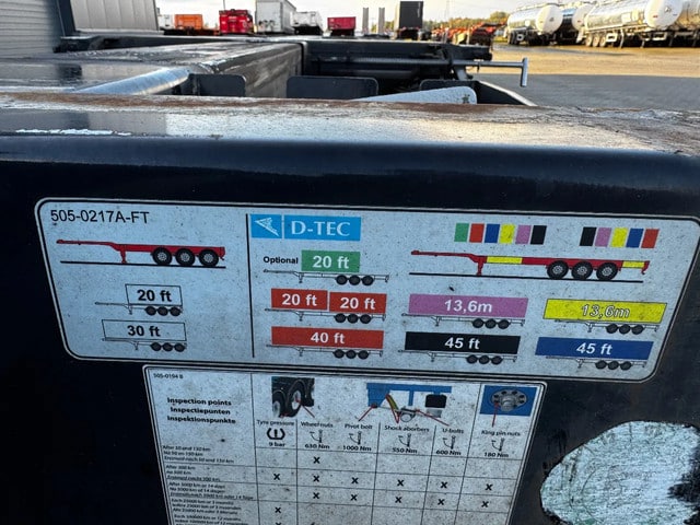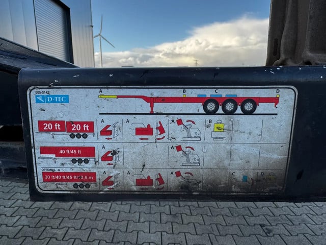 mooi 2014 D-TEC FLEXITRAILER 45FT HC-chassis , BPW-assen met trommelremmen, ABS/EBS, 1e as = liftas, 3x uitschuifbaar (voor, midden en achter), 1x20FT, 2x20FT, 1x20FT centraal, 1x30FT, 1x40FT, 1x40FT HC, 1x45FT HC, leeggewicht: 4.962kg, GVW: 43.000kg, 385/55-R22.5 banden (R: 14/10/5mm; L: 13/11/6mm), Nederlandse registratie