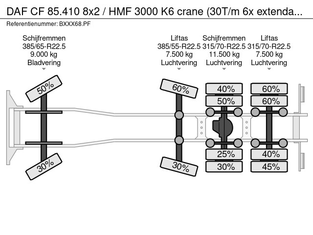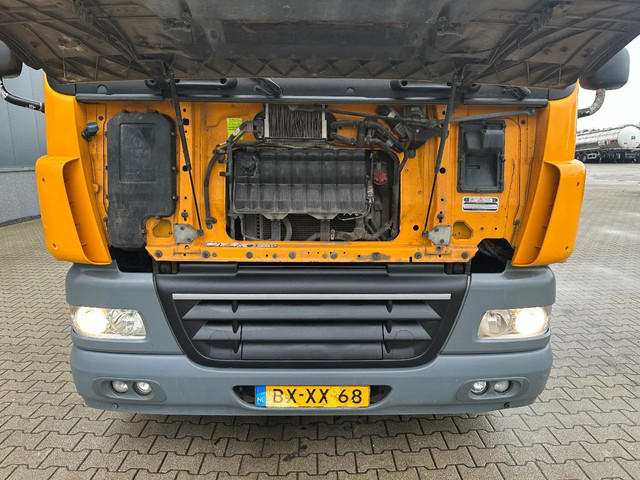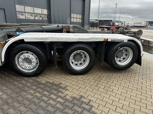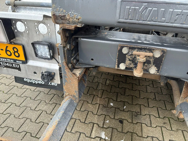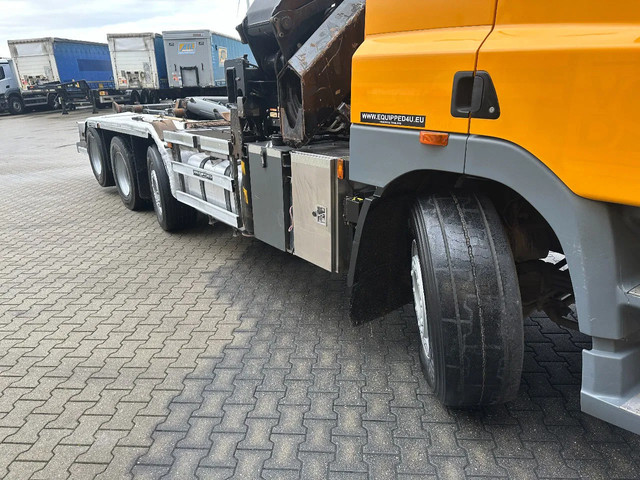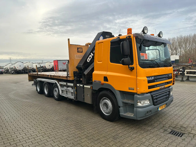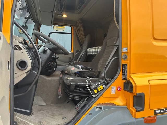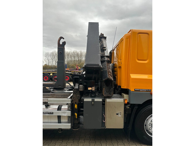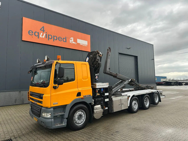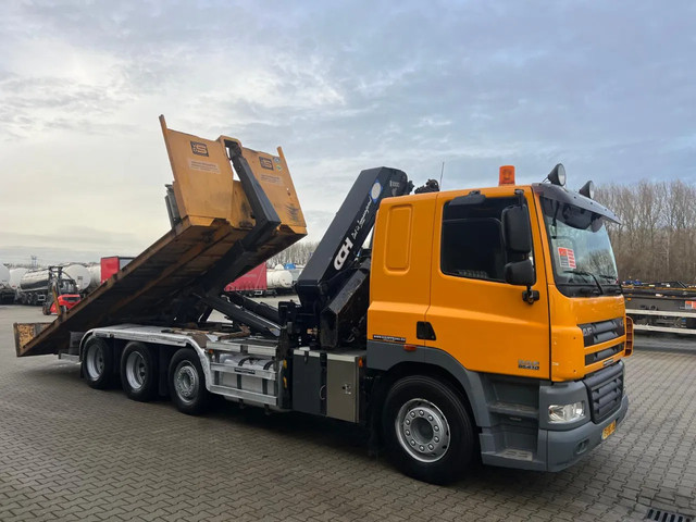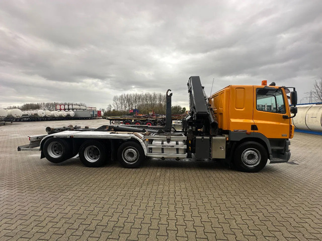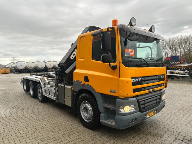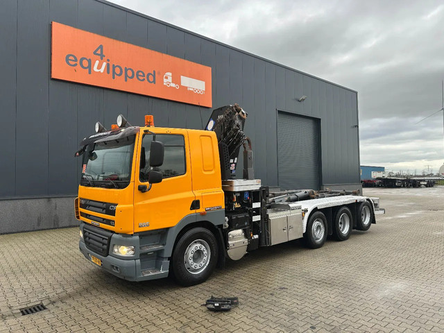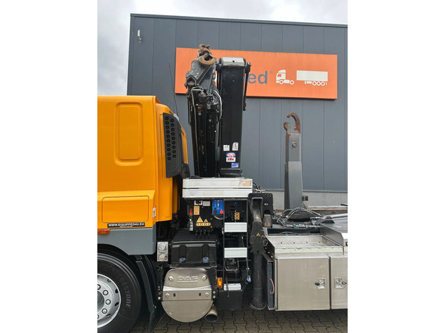 2011 DAF CF85.410 met HMF 3000 K6 kraan (6x uitschuifbaar) + radiografische afstandsbediening (incl. lader/ reservebatterij), , HYVALIFT 26 tons haak + platte afrolcontainer met zijborden en rongpotten, 798.895km, automatische versnellingsbak, airconditioning, 1x bed, radio/cd, Nederlandse registratie met geldige technische keuring (APK) t/m 12-01-2026.