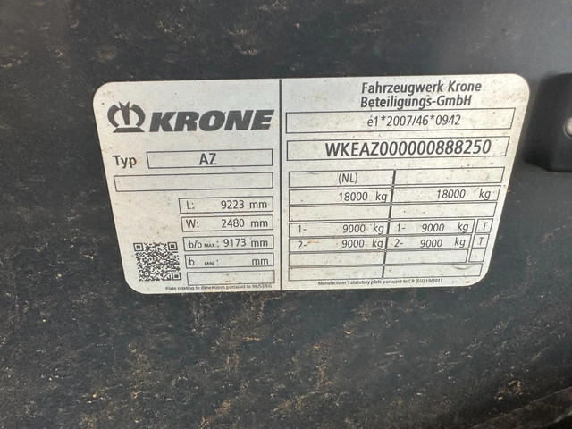 Remolque KRONE AZ18 MAXI de 2 ejes del año 2019 en buen estado, con ABS/EBS, ejes BPW con frenos de disco, 2 válvulas de elevación y descenso, altura 105 cm, neumáticos 445/45-R19.5 (profundidad del dibujo a la izquierda: 9/9 mm; profundidad del dibujo a la derecha: 7/8 mm), peso en vacío: 2.820 kg, masa máxima: 18.000 kg, matriculación neerlandesa, 4 unidades disponibles
