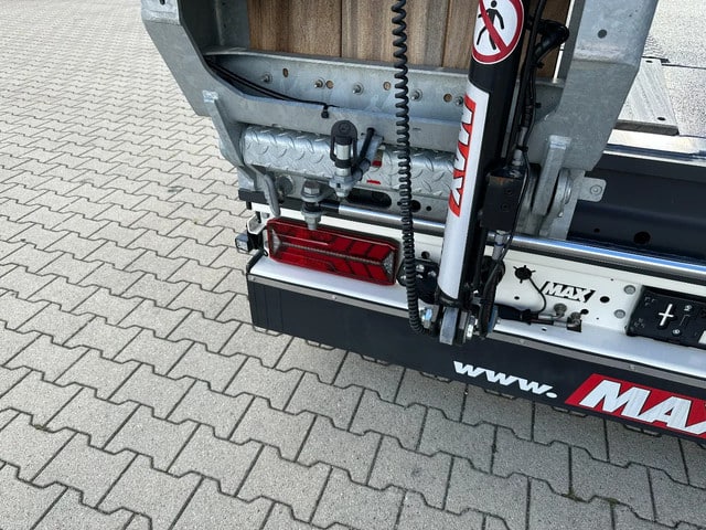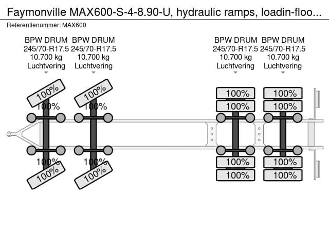 NIEUWE en ONGEBRUIKTE MAXTRAILER MAX600-S-4-8.90-U 4-assige aanhanger met hydraulische bedienbare en verplaatsbare rampen, laadvloer 890cmmet afschuining achteraan, ABS/EBS, TPMS, BPW assen met trommelremmen, luchtgeveerd met hef- en daalventiel, draaistel met dissel van ca. 1750mm en 50mm trekoog, koppelingshoogte 830-1010mm belast, breedteborden, zwaailamp, 6 paar kokers voor rongotten (ca. 100x50mm), 245/70-R17.5 banden