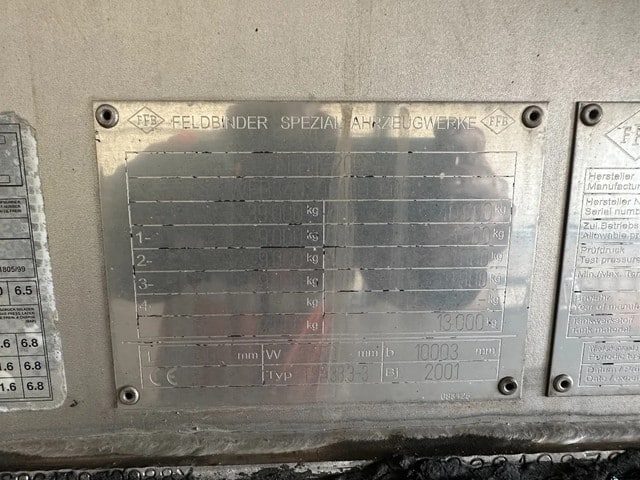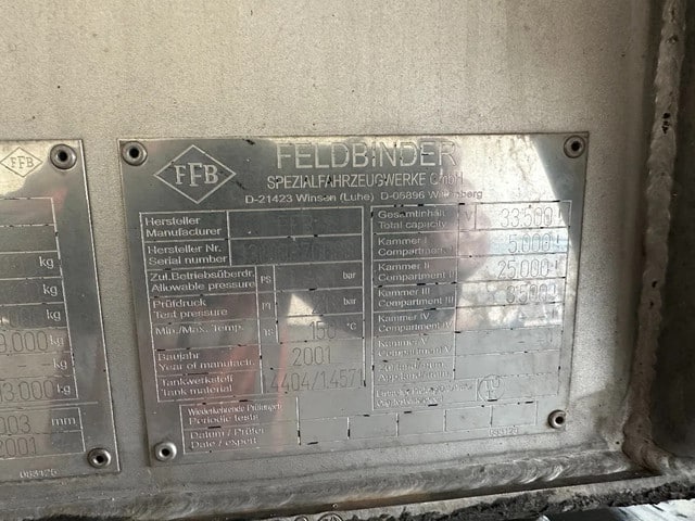 mooie 06/2001 FELDBINDER levensmiddelen tankoplegger met een inhoud van 33.500L, 3 compartiment (comp. 1: 5.000L / comp. 2: 25.000L + 1x slingerschot / comp. 3: 3.500L), incl pomp (merk: UNIBLOC), 3x SAF assen met schijfremmen (INTRADISC), leeggewicht: 7.800kg, max. massa: 39.000kg, 385/65-R22.5 banden (L: 11/15/9mm; R: 12/15/11mm), ALCOA-velgen, Nederlandse registratie met geldige technische keuring (APK) t/m: 20/07/2026