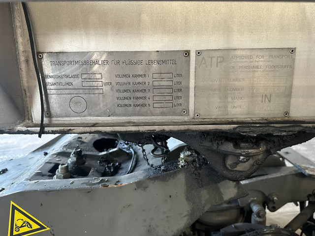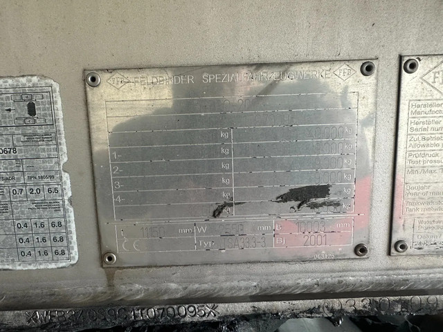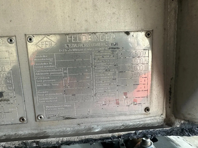 mooie 06/2001 FELDBINDER levensmiddelen tankoplegger met een inhoud van 33.500L, 3 compartiment (comp. 1: 5.000L / comp. 2: 25.000L + 1x slingerschot / comp. 3: 3.500L), incl pomp (merk: UNIBLOC), 3x SAF assen met schijfremmen (INTRADISC), leeggewicht: 7.800kg, max. massa: 39.000kg, 385/65-R22.5 banden (L: 5/14/9mm; R: 8/15/10mm), ALCOA-velgen, Nederlandse registratie met geldige technische keuring (APK) t/m: 31/10/2026