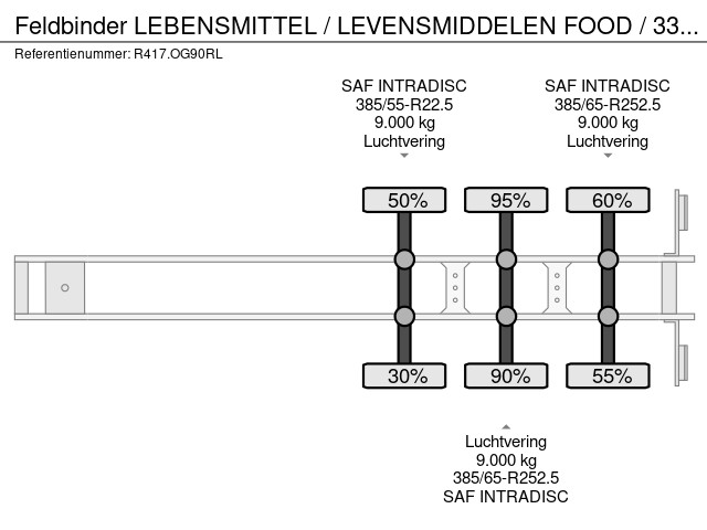 Achteras 1: Bandenmaat: 385/55-R22.5; Max. aslast: 9000 kg; Bandenprofiel links: 30%; Bandenprofiel rechts: 50%
