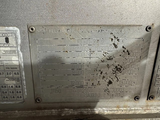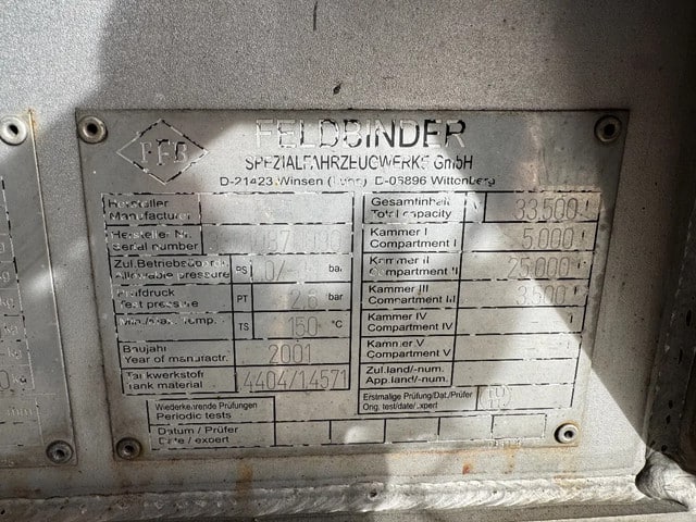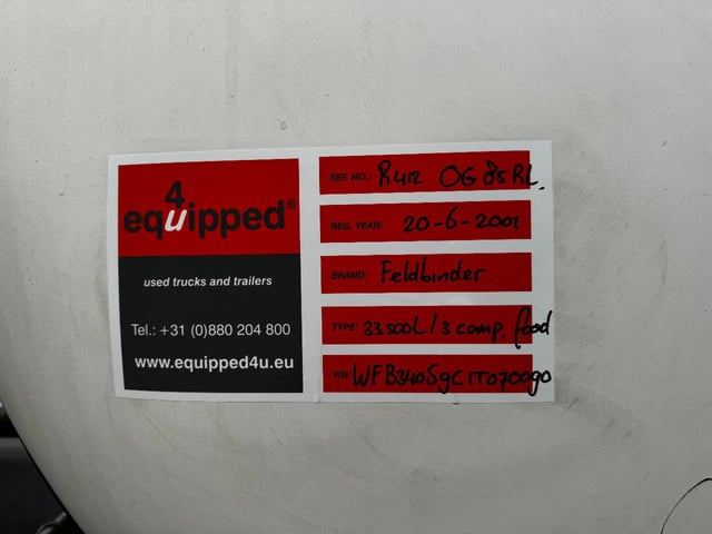 mooie 06/2001 FELDBINDER levensmiddelen tankoplegger met een inhoud van 33.500L, 3 compartiment (comp. 1: 5.000L / comp. 2: 25.000L + 1x slingerschot / comp. 3: 3.500L), incl pomp (merk: UNIBLOC), 3x SAF assen met schijfremmen (INTRADISC), leeggewicht: 7.800kg, max. massa: 39.000kg, 385/65-R22.5 banden (L: 9/12/6mm; R: 7/9/5mm), ALCOA-velgen, Nederlandse registratie met geldige technische keuring (APK) t/m: 28/10/2026