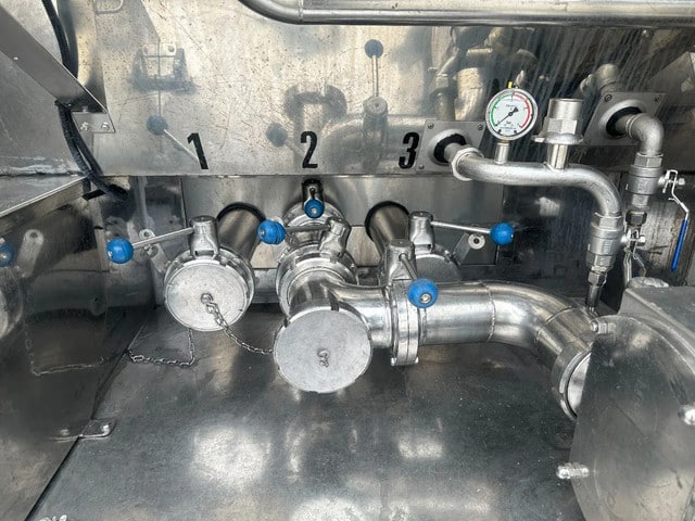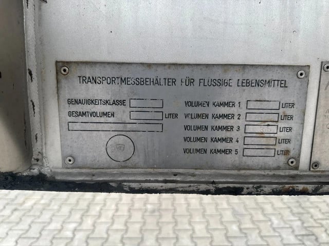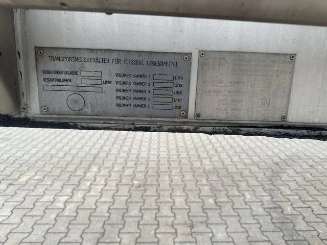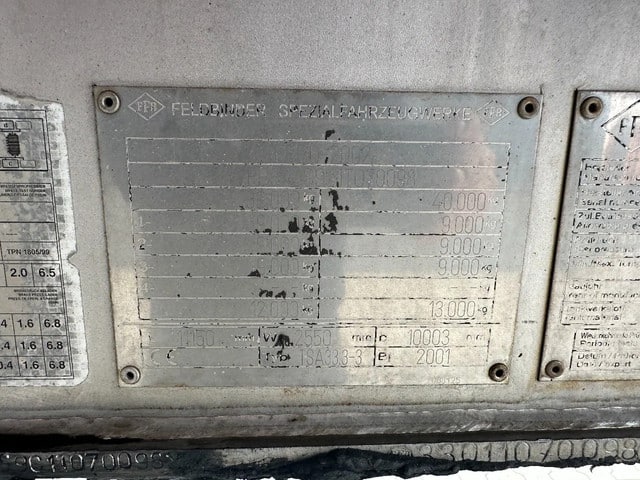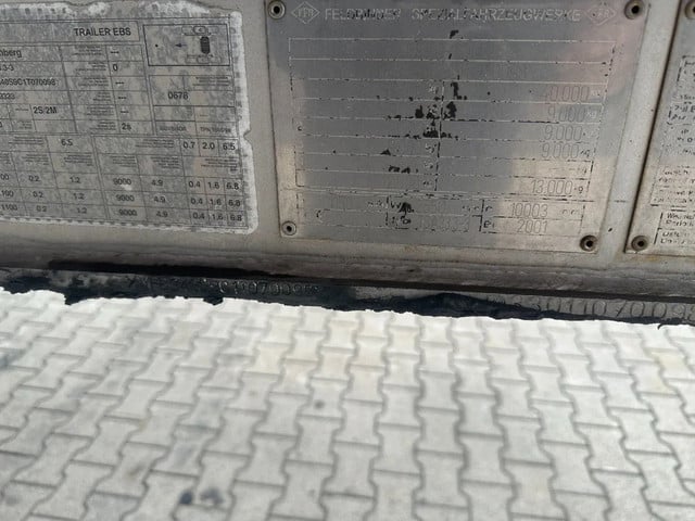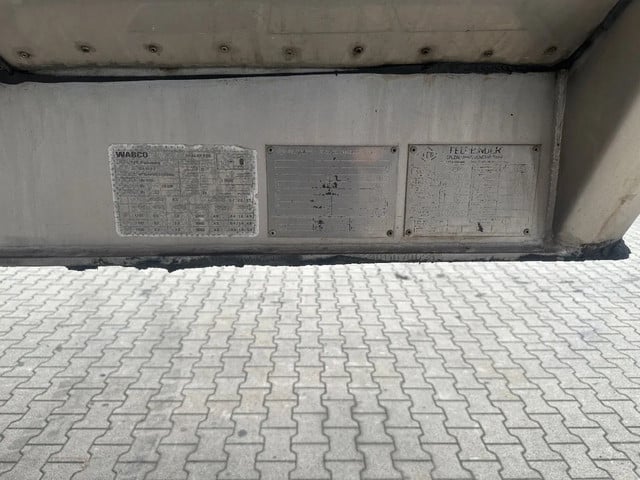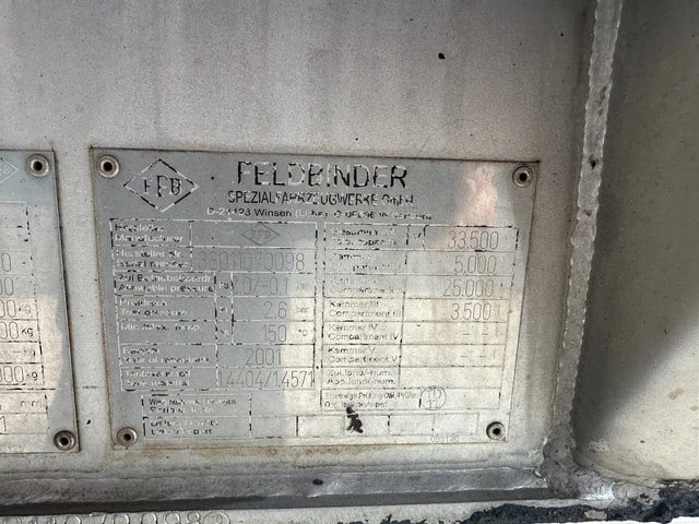 mooie 06/2001 FELDBINDER levensmiddelen tankoplegger met een inhoud van 33.500L, 3 compartiment (comp. 1: 5.000L / comp. 2: 25.000L + 1x slingerschot / comp. 3: 3.500L), incl pomp (merk: UNIBLOC), 3x SAF assen met schijfremmen (INTRADISC), leeggewicht: 7.800kg, max. massa: 39.000kg, 385/65-R22.5 banden (L: 8/11/13mm; R: 8/15/13mm), ALCOA-velgen, Nederlandse registratie met geldige technische keuring (APK) t/m: 29/09/2026