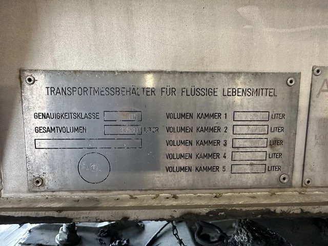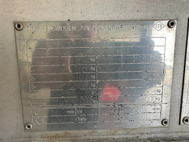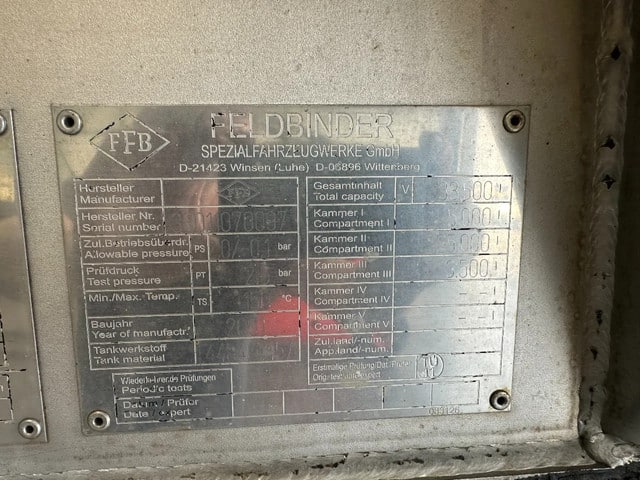 mooie 06/2001 FELDBINDER levensmiddelen tankoplegger met een inhoud van 33.500L, 3 compartiment (comp. 1: 5.000L / comp. 2: 25.000L + 1x slingerschot / comp. 3: 3.500L), incl pomp (merk: UNIBLOC), 3x SAF assen met schijfremmen (INTRADISC), leeggewicht: 7.800kg, max. massa: 39.000kg, 385/65-R22.5 banden (L: 6/9/10mm; R: 8/9/12mm), ALCOA-velgen, Nederlandse registratie met geldige technische keuring (APK) t/m: 03/10/2026