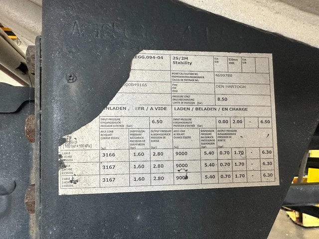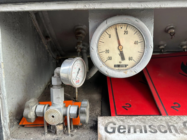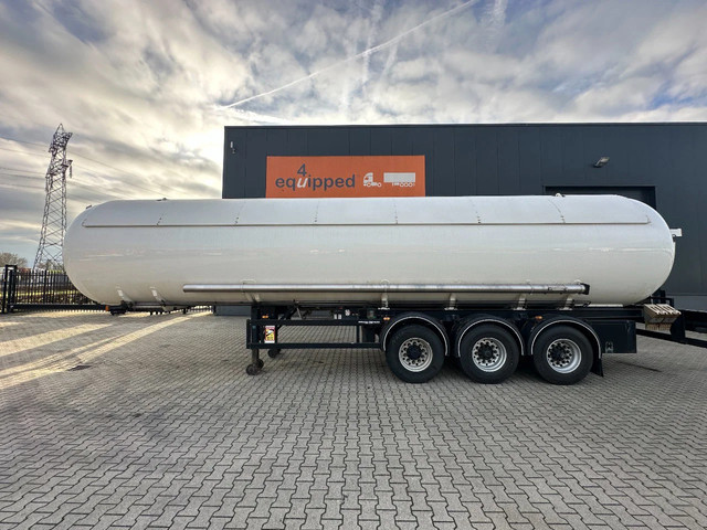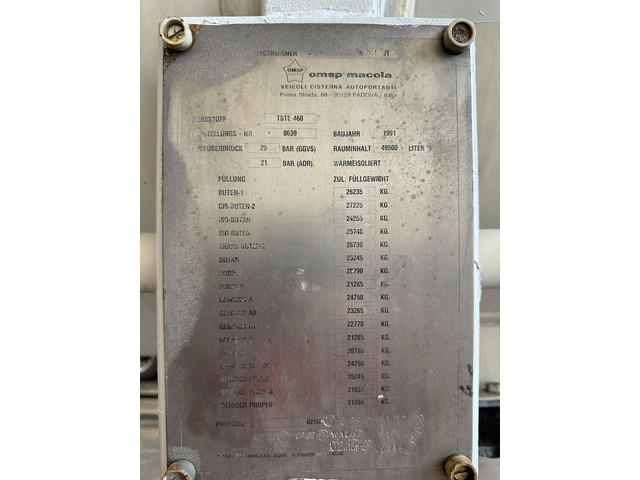1992 OMSP MACOLA tankoplegger voor butaan/propaan/gas, 49.500L (1 comp.), ADR (FL, AT), dichtheidskeuring t/m 02-2026, terugkerende tankkeuring t/m 02-2029, ABS/EBS, BPW Eco-Plus-assen met trommelremmen, Alcoa, centrale smering, 1e as = liftas, 25 bar testdruk, compleet met pomp, 385/65-R22.5 banden (L: 7/15/14mm; R: 12/14/7mm), leeggewicht: 12.200kg, max massa: 34.000kg, Duitse registratie