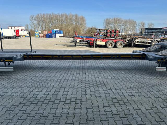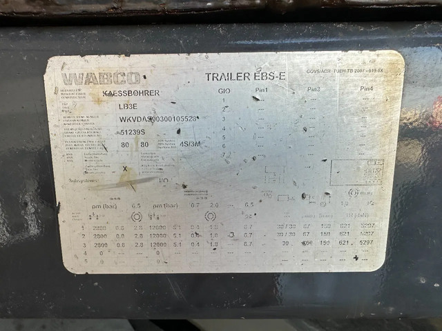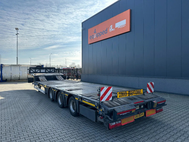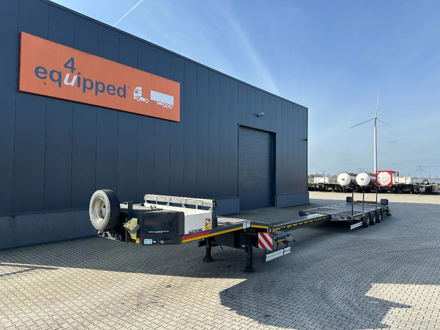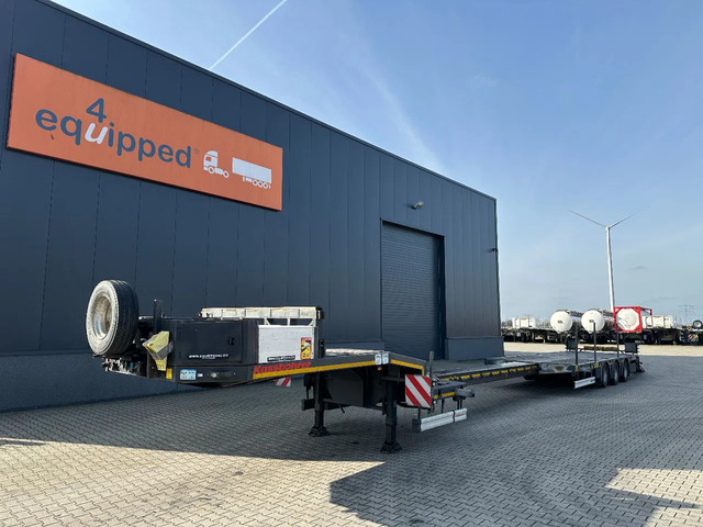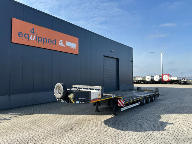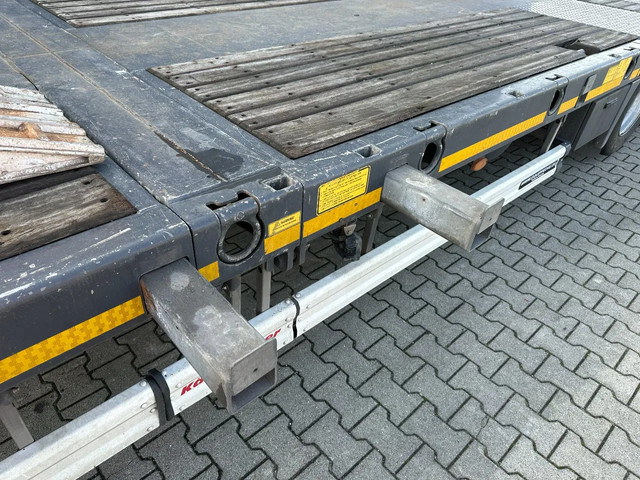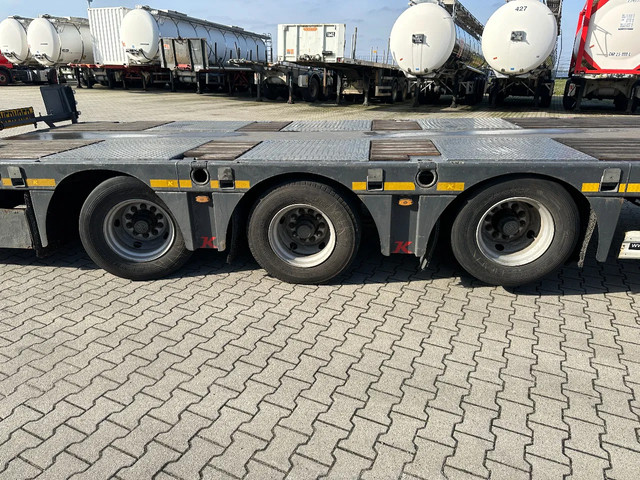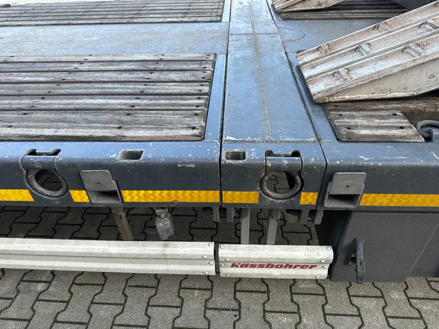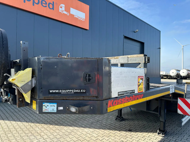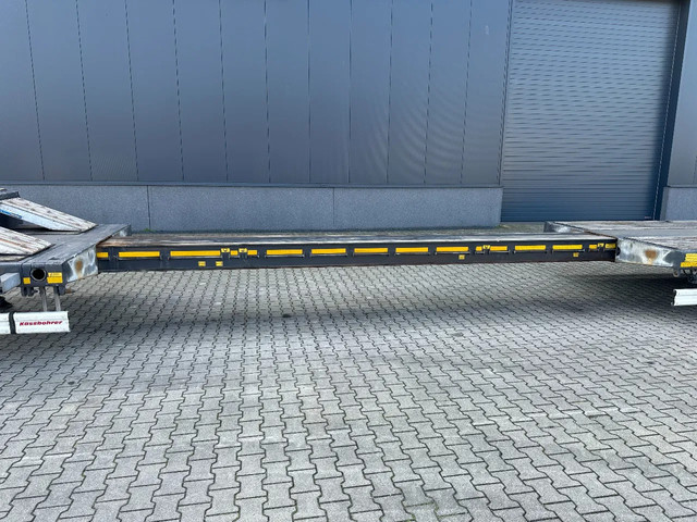 in zeer goede staat 2020 KASSBOHRER LOWBED LB3E uitschuifbare dieplader met ABS/EBS, 1x uitschuifbaar (600cm), 2 sets oprijplaten, BPW Eco-Plus -assen met trommelremmen, 3e as = stuuras (naloopas), hardhouten vloer (vloerhoogte: 86cm) met 9x verbreders (L+R: oplegger is verbreedbaar tot 3150mm), 9 zware sjorogen in de kantbalken (L+R), 6 zware sjorogen in de vloer (L+R), 10 rongpotten(L+R) + 12 rongen. 3x twistlocks (L+R) + containerrek, steunpoten achter, 4x breedtebord, 245/70-R15.5 banden (profiel links: 8/9, 11/10, 8/8mm; profiel r: 9/9, 10/11, 9/9mm), leeggewicht: 11.960kg, max massa: 48.000kg, Nederlandse registratie met geldige technische keuring (APK) t/m 13-02-2027