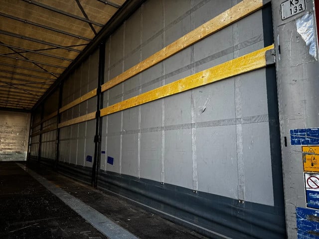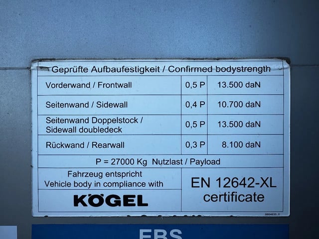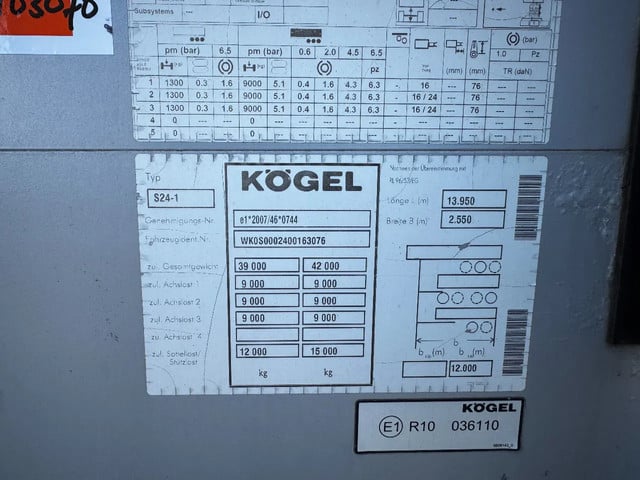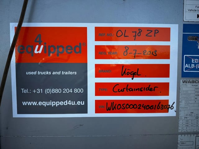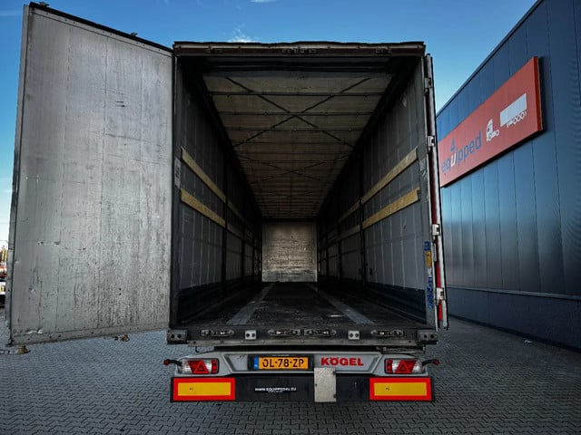 07/2013 Kögel schuifzeiloplegger met SAF-assen met schijfremmen (INTRADISC), ABS/EBS, schuifdak, achterdeuren, inw.: 13.64×2.49×2.77m, 2x 13 sjorogen, leeggewicht: 6.450kg, max. massa: 42.000kg, 385/65-R22.5 banden (L: 9/13/9mm; L: 2/15/10mm), Nederlandse registratie