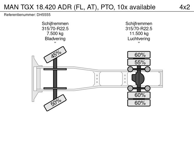 Achteras: Dubbellucht; Max. aslast: 11500 kg; Bandenprofiel linksbinnen: 60%; Bandenprofiel linksbuiten: 60%; Bandenprofiel rechtsbinnen: 55%; Bandenprofiel rechtsbuiten: 60%