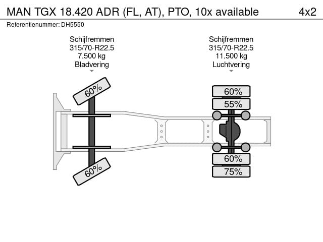 Vooras: Max. aslast: 7500 kg; Meesturend; Bandenprofiel links: 60%; Bandenprofiel rechts: 60%