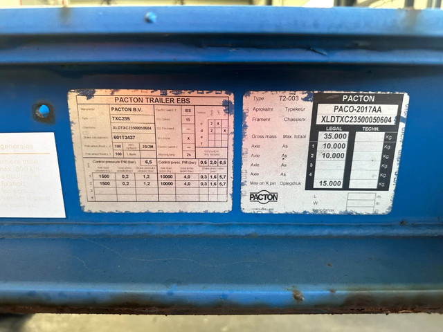mooi 2005 PACTON 2-assig 20FT chassis met BPW Eco-Plus assen en trommelremmen, ADR (EX/II, EX/III, FL, AT) geldig t/m 23-02-2026, ABS/EBS, leeggewicht: 3.340kg, GVW: 35.000kg, 2x 10 tons assen, 425/65-R22.5 banden (L: 15/16mm; R: 15/16mm), Nederlandse registratie met geldige technische keuring (APK) t/m 23-02-2026