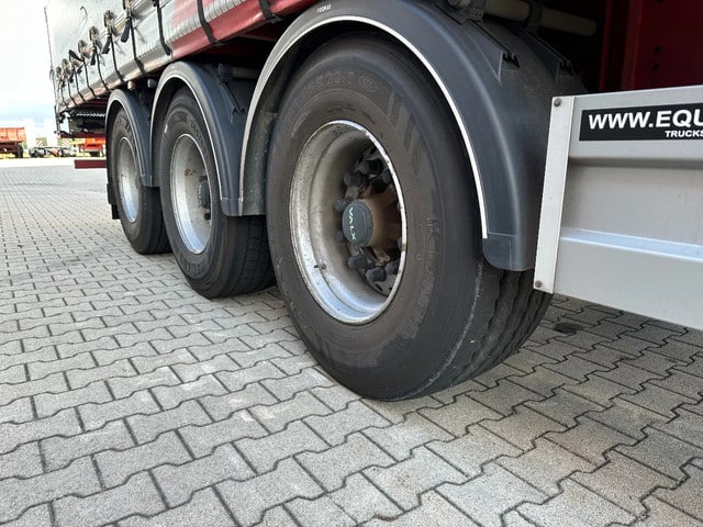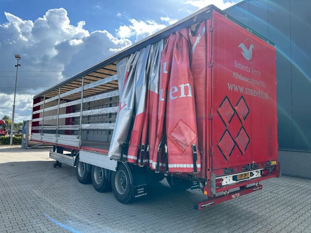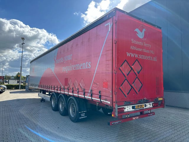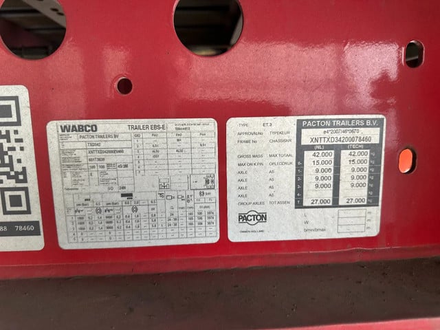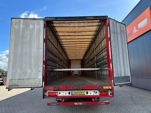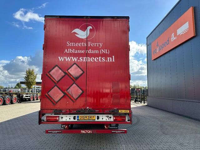 zeer mooie 08/2020 Pacton schuifzeil oplegger met zijborden met ABS/EBS, VALX-assen met trommelremmen, bandenmaat 385/65-R22.5 (profiel links: 15/16/14mm; profiel rechts: 15/12/14mm), aluminium zijborden 400mm hoog, aluminium huifplanken, hardhouten vloer, TÜV certificaat 32 ton, schuifdak, achterdeuren, 2x 4 schuifrongen op vaste positie, ferryogen 2 x 4 stuks, bindhaken in de zijrand 2 x 30 stuks (2.000 kg per stuk), sterke zijranden, verzinkte vloerplaat op achterste deel hardhouten vloer, inwendige lengte: 13.620mm, inwendige breedte: 2.470mm, inw. tussen rongen: 2.470mm, inwendige hoogte: 2.680 mm, insteekhoogte zijkant: 2.600mm, insteekhoogte achter: 2.600mm, insteekbreedte achter: 2.460mm, leeggewicht: 7.150kg, max. massa: 42.000kg, Nederlandse registratie met geldige technische keuring (APK) t/m 18-08-2026