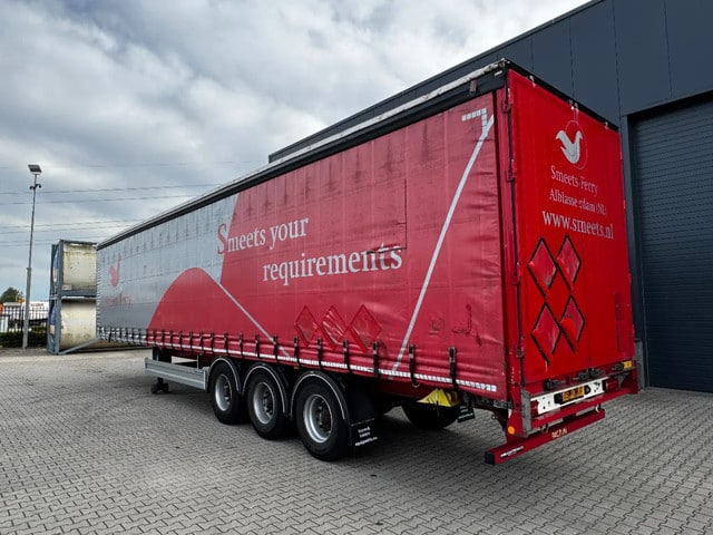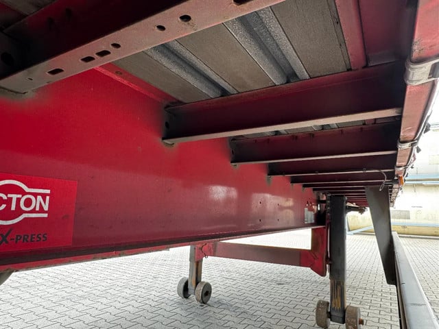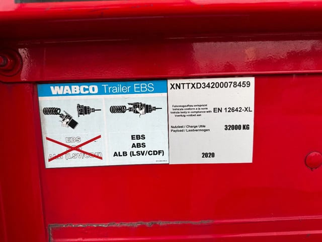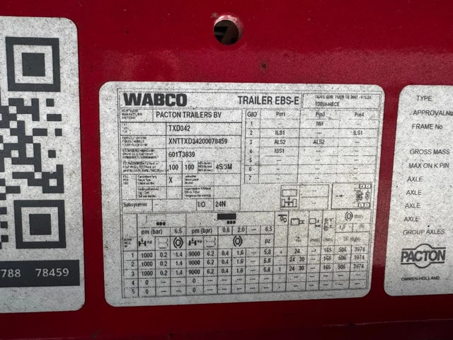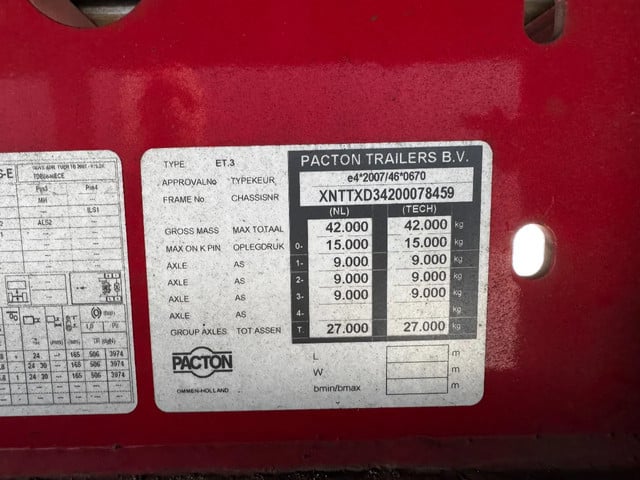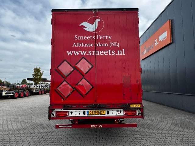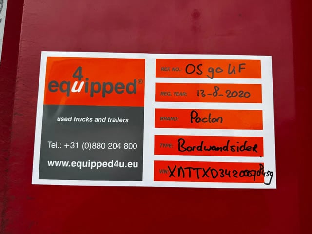zeer mooie 08/2020 Pacton schuifzeil oplegger met zijborden met ABS/EBS, VALX-assen met trommelremmen, bandenmaat 385/65-R22.5 (profiel links: 14/12/10mm; profiel rechts: 13/7/10mm), aluminium zijborden 400mm hoog, aluminium huifplanken, hardhouten vloer, TÜV certificaat 32 ton, schuifdak, achterdeuren, 2x 4 schuifrongen op vaste positie, ferryogen 2 x 4 stuks, bindhaken in de zijrand 2 x 30 stuks (2.000 kg per stuk), sterke zijranden, verzinkte vloerplaat op achterste deel hardhouten vloer, inwendige lengte: 13.620mm, inwendige breedte: 2.470mm, inw. tussen rongen: 2.470mm, inwendige hoogte: 2.680 mm, insteekhoogte zijkant: 2.600mm, insteekhoogte achter: 2.600mm, insteekbreedte achter: 2.460mm, leeggewicht: 7.150kg, max. massa: 42.000kg, Nederlandse registratie met geldige technische keuring (APK) t/m 13-08-2026