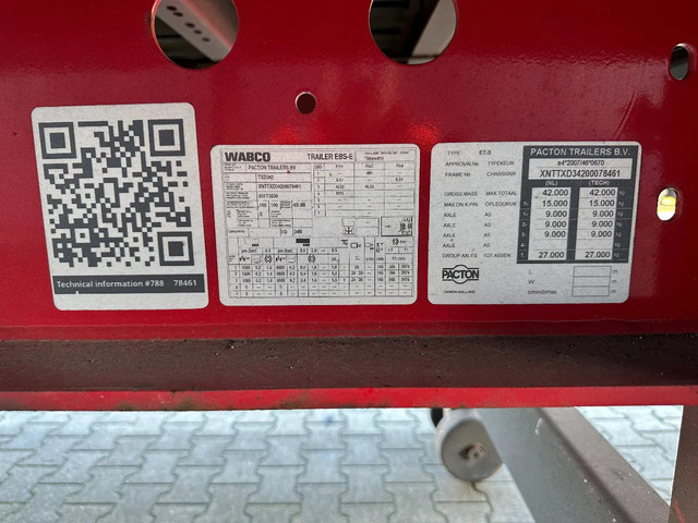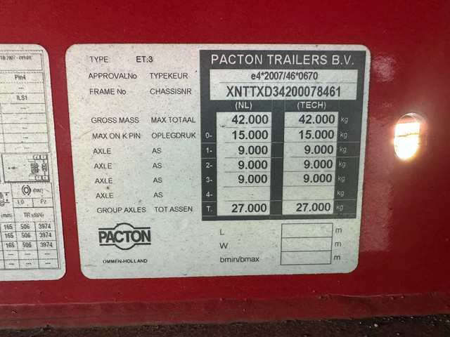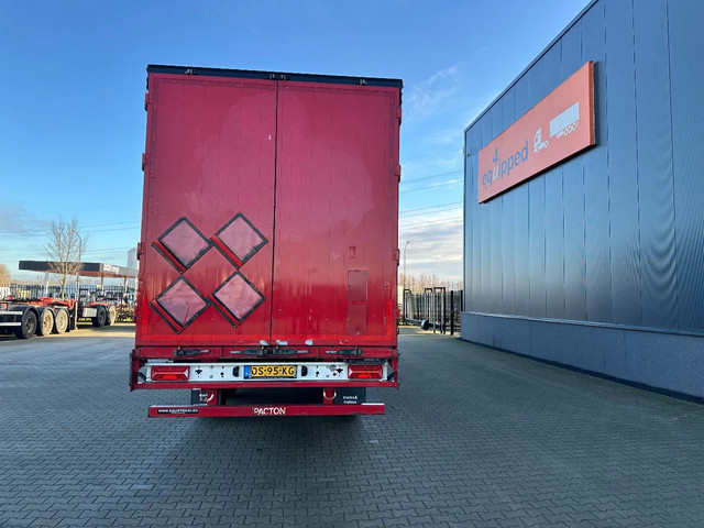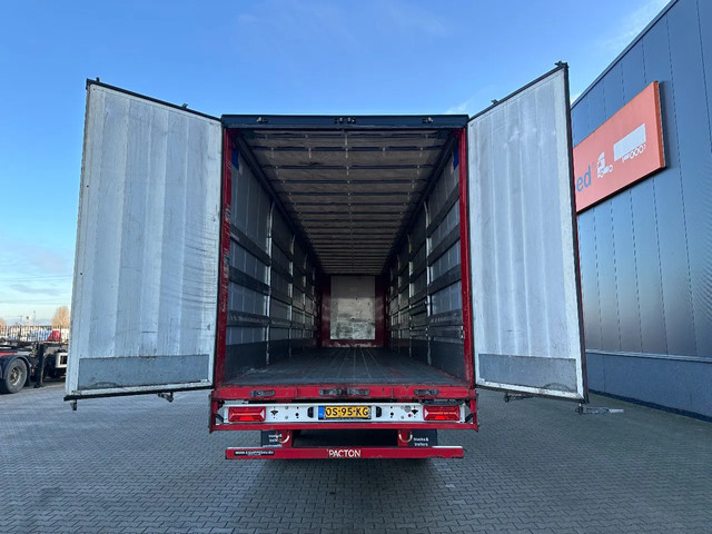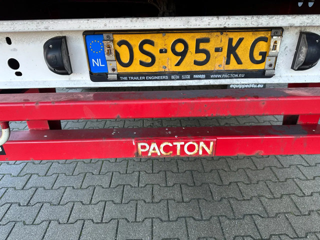 zeer mooie 08/2020 Pacton schuifzeil oplegger met zijborden met nieuwe grijze zeilen (Code-XL) ABS/EBS, VALX-assen met trommelremmen, bandenmaat 385/65-R22.5 (profiel links: 13/13/10mm; profiel rechts: 12/10/11mm), aluminium zijborden 400mm hoog, aluminium huifplanken, hardhouten vloer, TÜV certificaat 32 ton, schuifdak, achterdeuren, 2x 4 schuifrongen op vaste positie, ferryogen 2 x 4 stuks, bindhaken in de zijrand 2 x 30 stuks (2.000 kg per stuk), sterke zijranden, verzinkte vloerplaat op achterste deel hardhouten vloer, inwendige lengte: 13.620mm, inwendige breedte: 2.470mm, inw. tussen rongen: 2.470mm, inwendige hoogte: 2.680 mm, insteekhoogte zijkant: 2.600mm, insteekhoogte achter: 2.600mm, insteekbreedte achter: 2.460mm, leeggewicht: 7.150kg, max. massa: 42.000kg, Nederlandse registratie met geldige technische keuring (APK) t/m 14-08-2026