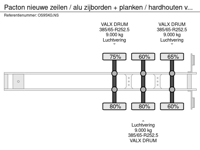Achteras 3: Max. aslast: 9000 kg; Bandenprofiel links: 60%; Bandenprofiel rechts: 65%