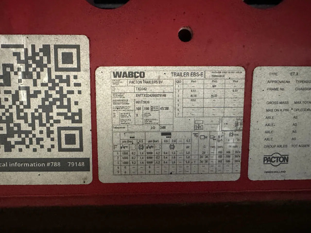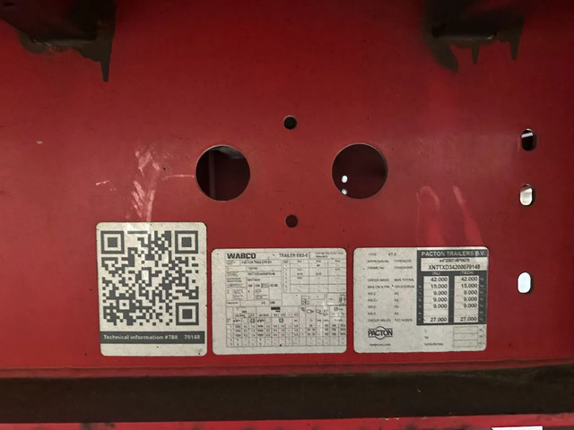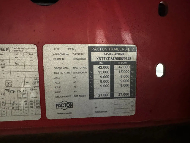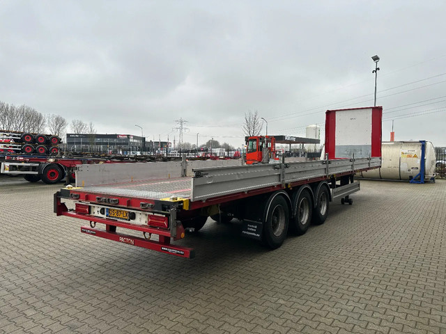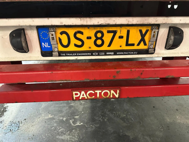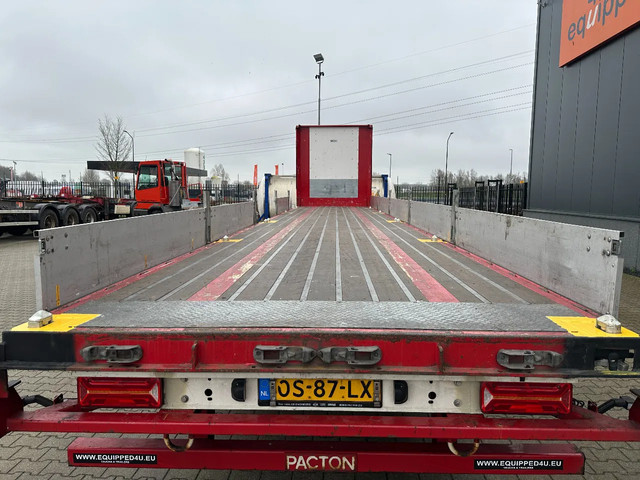 zeer mooie 11/2020 PACTON platte oplegger met 12 nieuwe twist locks geschikt voor 1x 40FT / 2x20FT / 1x 20FT centraal / 1x 30FT containers, ABS/EBS, hardhouten vloer, , VALX assen met trommelremmen, leeggewicht: 7.150kg, max massa: 42.000kg, 385/65 R22.5 banden (profiel links: 15/6/15mm; profiel rechts: 9/7/15mm), Nederlandse registratie met geldige technische keuring (APK) t/m 10-12-2026
