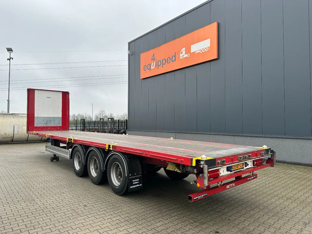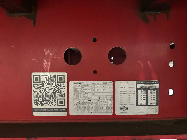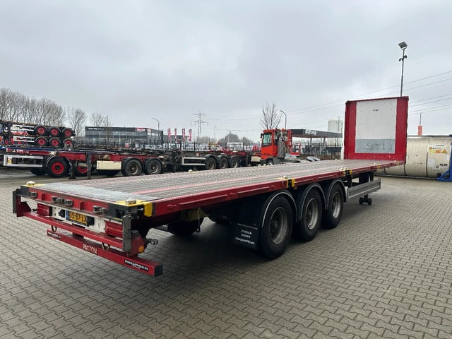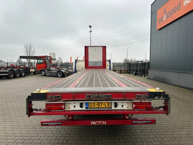 zeer mooie 11/2020 PACTON platte oplegger met 12 nieuwe twist locks geschikt voor 1x 40FT / 2x20FT / 1x 20FT centraal / 1x 30FT containers, ABS/EBS, hardhouten vloer, VALX assen met trommelremmen, leeggewicht: 7.150kg, max massa: 42.000kg, 385/65 R22.5 banden (profiel links: 15/6/15mm; profiel rechts: 9/7/15mm), Nederlandse registratie met geldige technische keuring (APK) t/m 10-12-2026