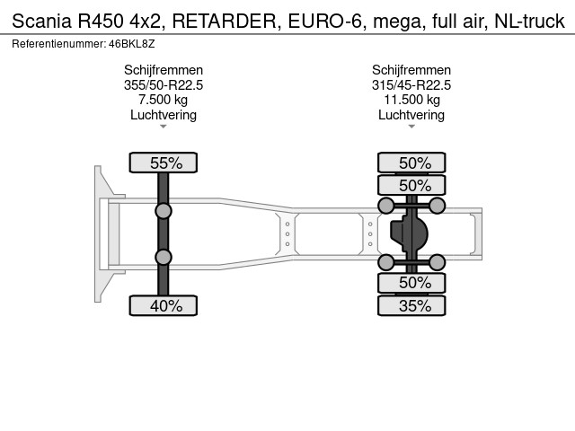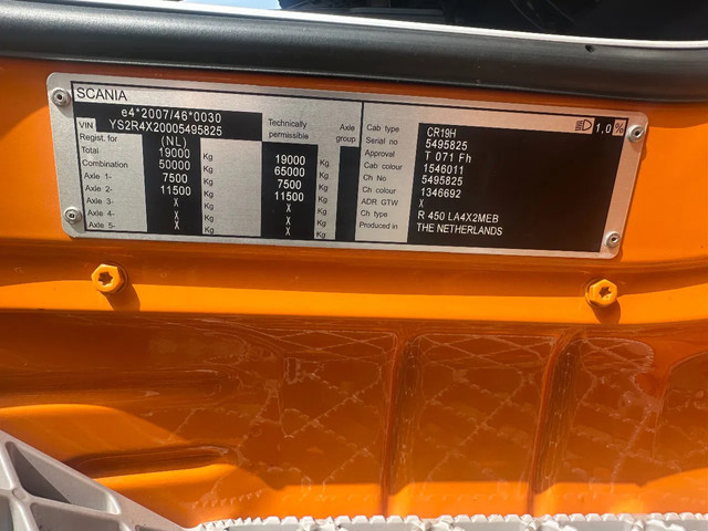zeer mooie 2018 Scania R450 EURO 6 4×2 mega met 1.106.789km, RETARDER, volledig luchtgeveerd, automatische airconditioning (climate control), koelkast, 2x bed, radio + navigatie, 1x brandstoftank (500L), banden voor: 355/50-R22.5 (L: 6mm; R: 9mm), banden achter: 315/45-R22.5 (L: 5/8mm; R: 8/8mm), VIN-nummer: YS2R4X20005495825, NL-truck met geldige technische keuring (APK) t/m 26-02-2026