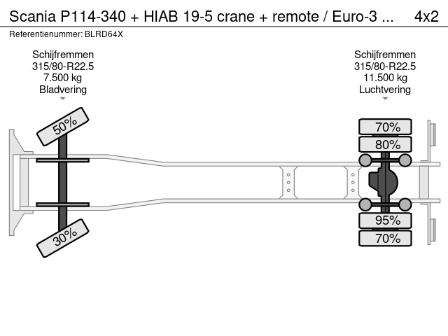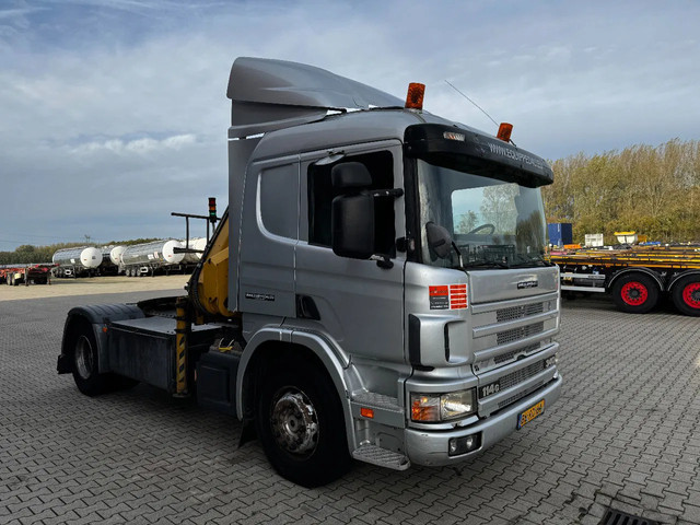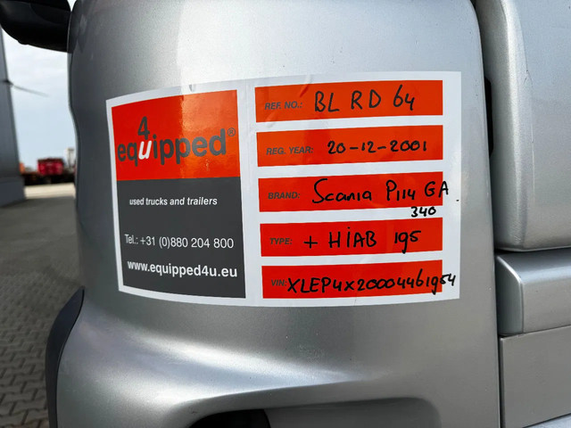 12/2001 Scania P114-340 4×2 met 948.550km en voorzien van HIAB 19-5 kraan (5x hydraulisch uitschuifbaar) met afstandsbediening, 4 hydraulische steunpoten, EURO-3, 3 pedalen, airconditioning, radio/cd, Nederlandse registratie