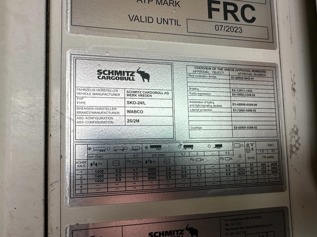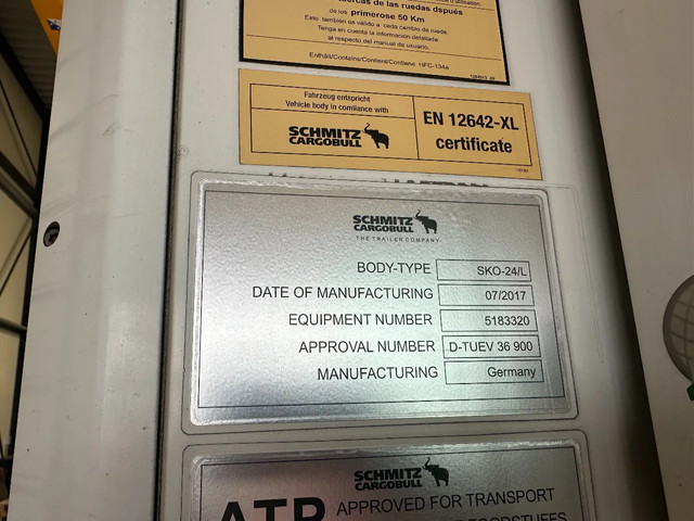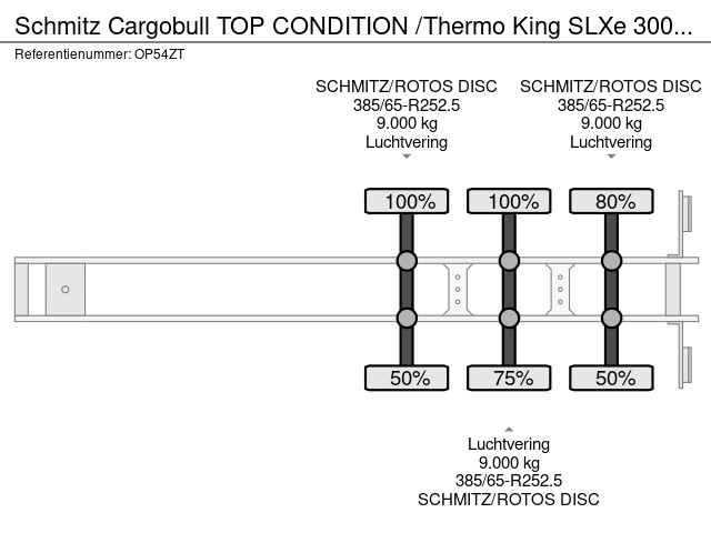 zeer mooie 10/2017 Schmitz Cargobull koeloplegger met ABS/EBS, ThermoKing SLXi 300 D/E met slechts 3.638 diesel draaiuren en 1.865 elektrische draaiuren, SCHMITZ/ROTOS-assen met schijfremmen, palletkist, aluminium vloer, Zepro ondervouwklep (2.500kg) met eigen accu’s en LPK t/m 05/2026, inw.: 1333x250x265cm, 385/65 R22.5 banden (profiel links: 8/12/8mm; profiel rechts: 16/16/13mm), leeggewicht: 8.665kg, max. massa: 42.000kg, Nederlandse registratie met geldige technische keuring (APK) t/m 11-04-2026