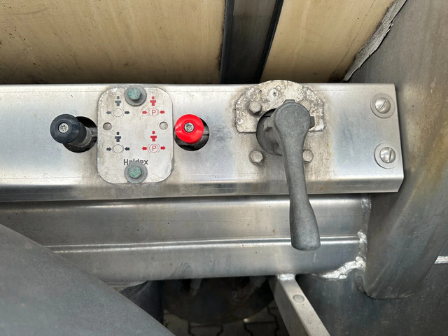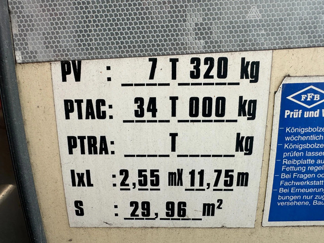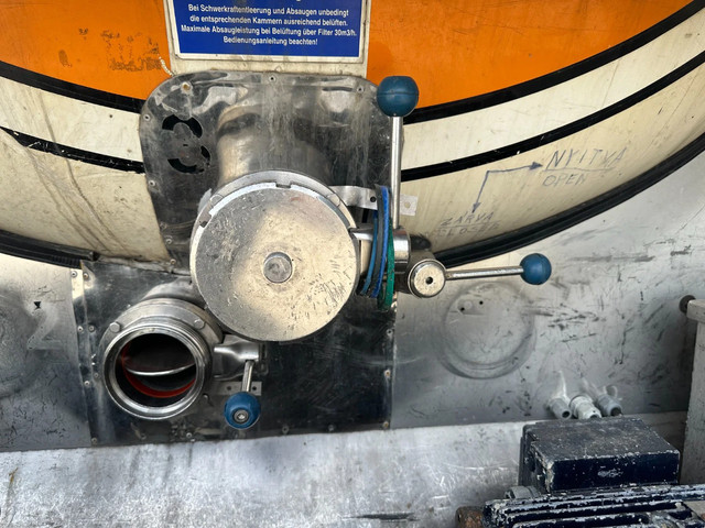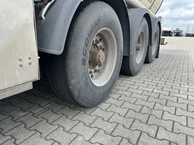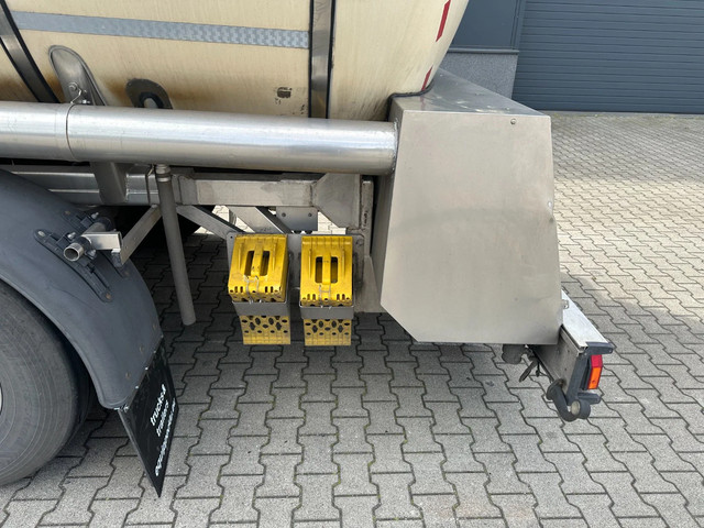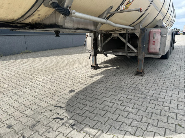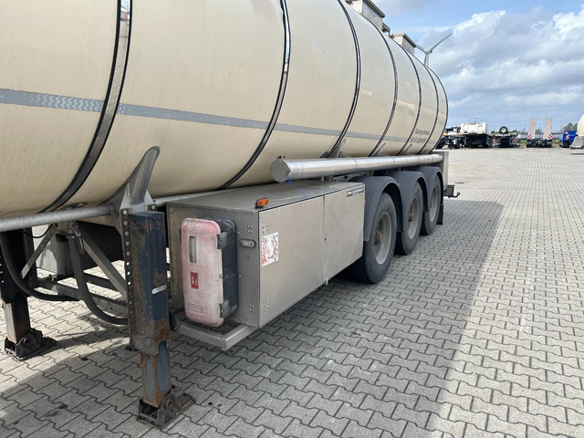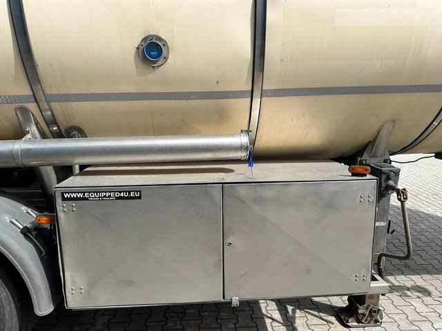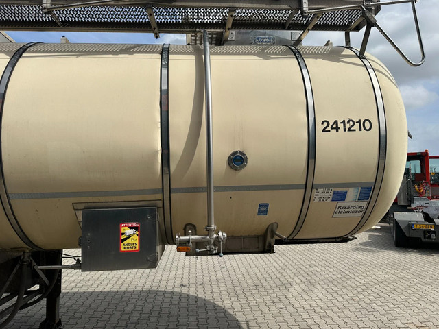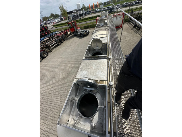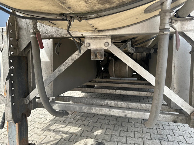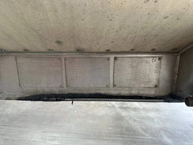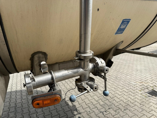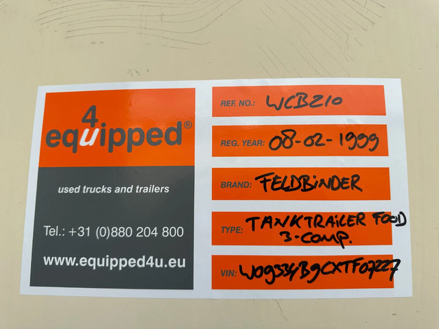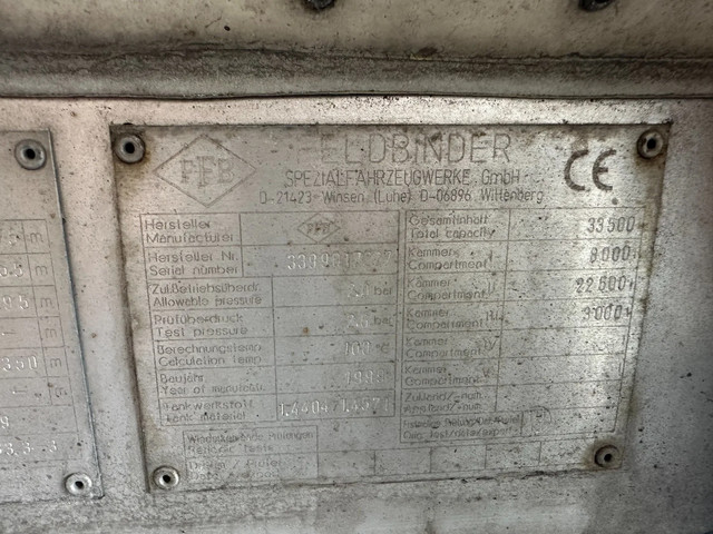 1999 FELDBINDER — напівпричіп-цистерна для харчових продуктів місткістю 33 500 л, 3 відсіки (відсік 1: 8 000 л / відсік 2: 22 500 л + 1 перегородка / відсік 3: 3 000 л), у комплекті з насосом (марка: IBEX PUMPE), ABS/EBS, 3 осі BPW з барабанними гальмами, 1-а вісь = підйомна вісь, диски ALCOA, власна вага: 7 320 кг, макс. вага: 34 000 кг, шини 385/65-R22.5 (Л: 6/6/4 мм; П: 6/6/6 мм)