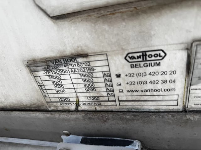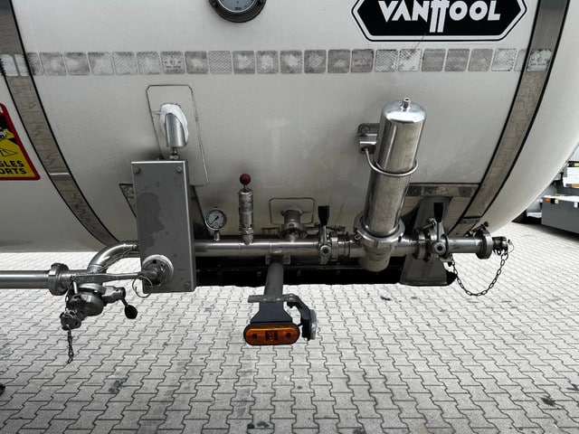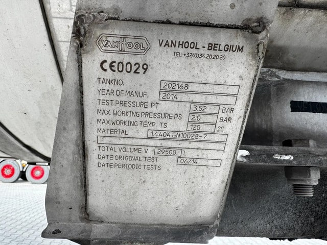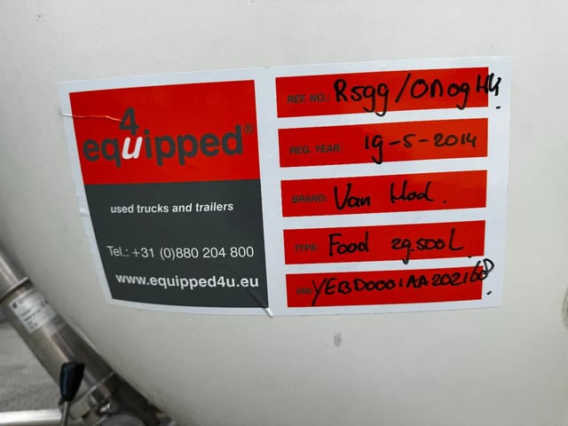 zeer mooie 2014 Van Hool levensmiddelen tankoplegger met een inhoud van 29.500L, 1 compartiment, 1x slingerschot, 3 x BPW assen met schijfremmen, leeggewicht: 5.860kg, max. massa: 39.000kg, 385/65-R22.5 banden (L: 11/13/6mm; R: 10/8/6mm), ALCOA-velgen, Nederlandse registratie met geldige technische keuring (APK) t/m: 18/12/2025