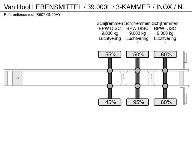 Achteras 1: Max. aslast: 9000 kg; Bandenprofiel links: 45%; Bandenprofiel rechts: 55%