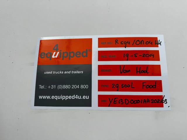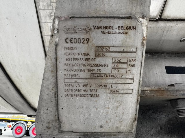 zeer mooie 2014 Van Hool levensmiddelen tankoplegger met een inhoud van 29.500L, 1 compartiment, 1x slingerschot, 3 x BPW assen met schijfremmen, leeggewicht: 5.860kg, max. massa: 39.000kg, 385/65-R22.5 banden (L: 7/5/9mm; R: 6/7/6mm), ALCOA-velgen, Nederlandse registratie met geldige technische keuring (APK) t/m: 08/02/2026