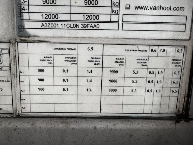 Achteras 3: Max. aslast: 9000 kg; Bandenprofiel links: 55%; Bandenprofiel rechts: 40%