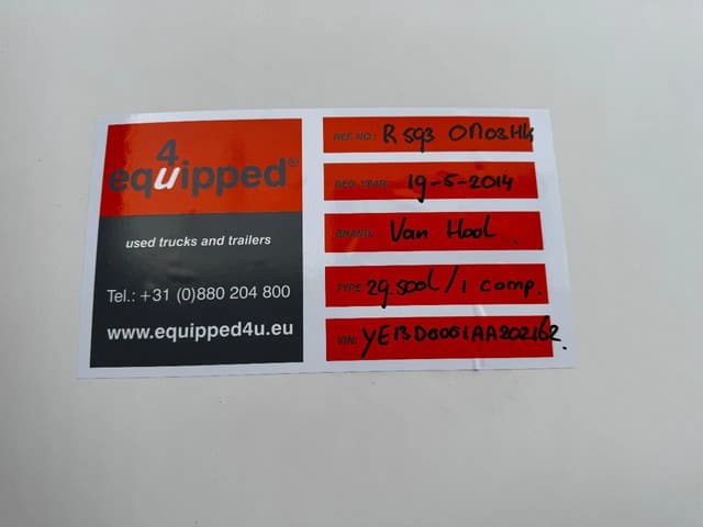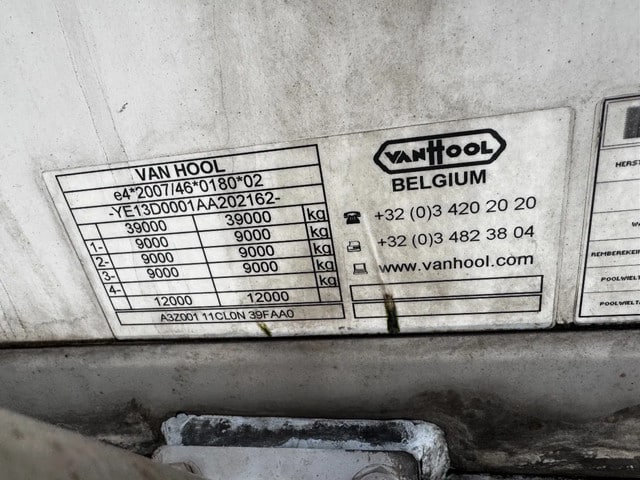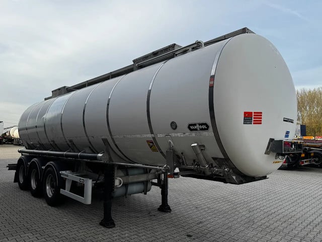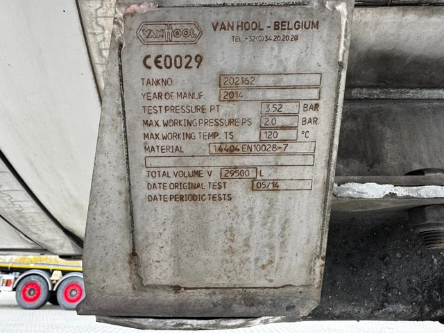 zeer mooie 2014 Van Hool levensmiddelen tankoplegger met een inhoud van 29.500L, 1 compartiment, 1x slingerschot, 3 x BPW assen met schijfremmen, leeggewicht: 5.860kg, max. massa: 39.000kg, 385/65-R22.5 banden (L: 4/5/4mm; R: 4/9/5mm), ALCOA-velgen, Nederlandse registratie met geldige technische keuring (APK) t/m: 13/03/2026