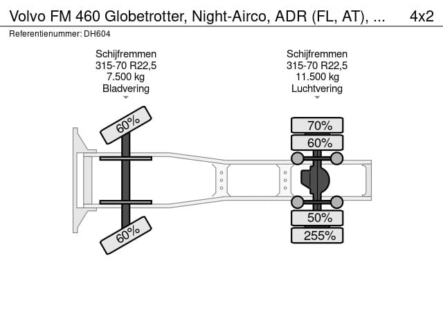 Achteras: Dubbellucht; Max. aslast: 11500 kg; Bandenprofiel linksbinnen: 50%; Bandenprofiel linksbuiten: 255%; Bandenprofiel rechtsbinnen: 60%; Bandenprofiel rechtsbuiten: 70%