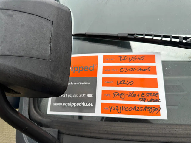 2005 VOLVO FM9-260 4×2 met hydraulisch in hoogte verstelbare schotel (merk: ESTEPE), zij-instap links en rechts, slechts 319.386km, automatische versnellingsbak, Euro-3, vangmuil, "oude" tachograaf, radio/CD, voorbanden 315/60-R22.5 banden (L: 10mm, R: 10mm), achterbanden 315/60-R22.5 (L: 10/9mm; R: 10/9mm) chassisnummer: YV2JHC0A25A597117, Nederlandse registratie met geldige technische keuring (APK) t/m 22-05-2026