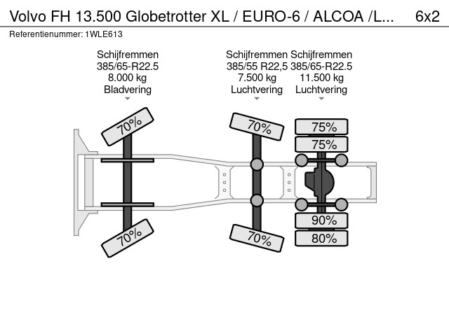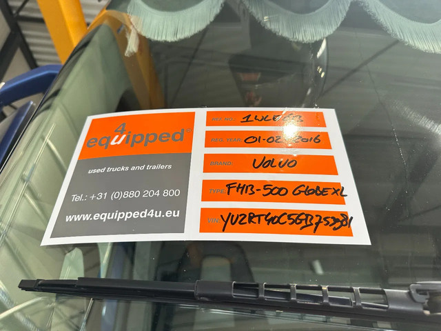 zeer mooie 2016 VOLVO FH13-500 Globetrotter XL EURO-6 met 734.806km, 2e as = lift- en stuuras, ALCOA-VELGEN. spoilers + fenders, airconditioning, I-Park cool, koelkast, 1x bed, PTO/hydrauliek, VEB, 27MC, banden vooras: 385/65-R22.5 (profiel links: 11mm; profiel rechts: 11mm), banden middenas 385/55-R22.5 (profiel links:11mm; profiel rechts: 11mm) banden achteras: 385/65-R22.5 (profiel links: 13/14mm; profiel rechts: 12/12mm), VIN: YV2RT40C5GB753981, Belgische registratie met geldige technische keuring t/m 05-07-2026